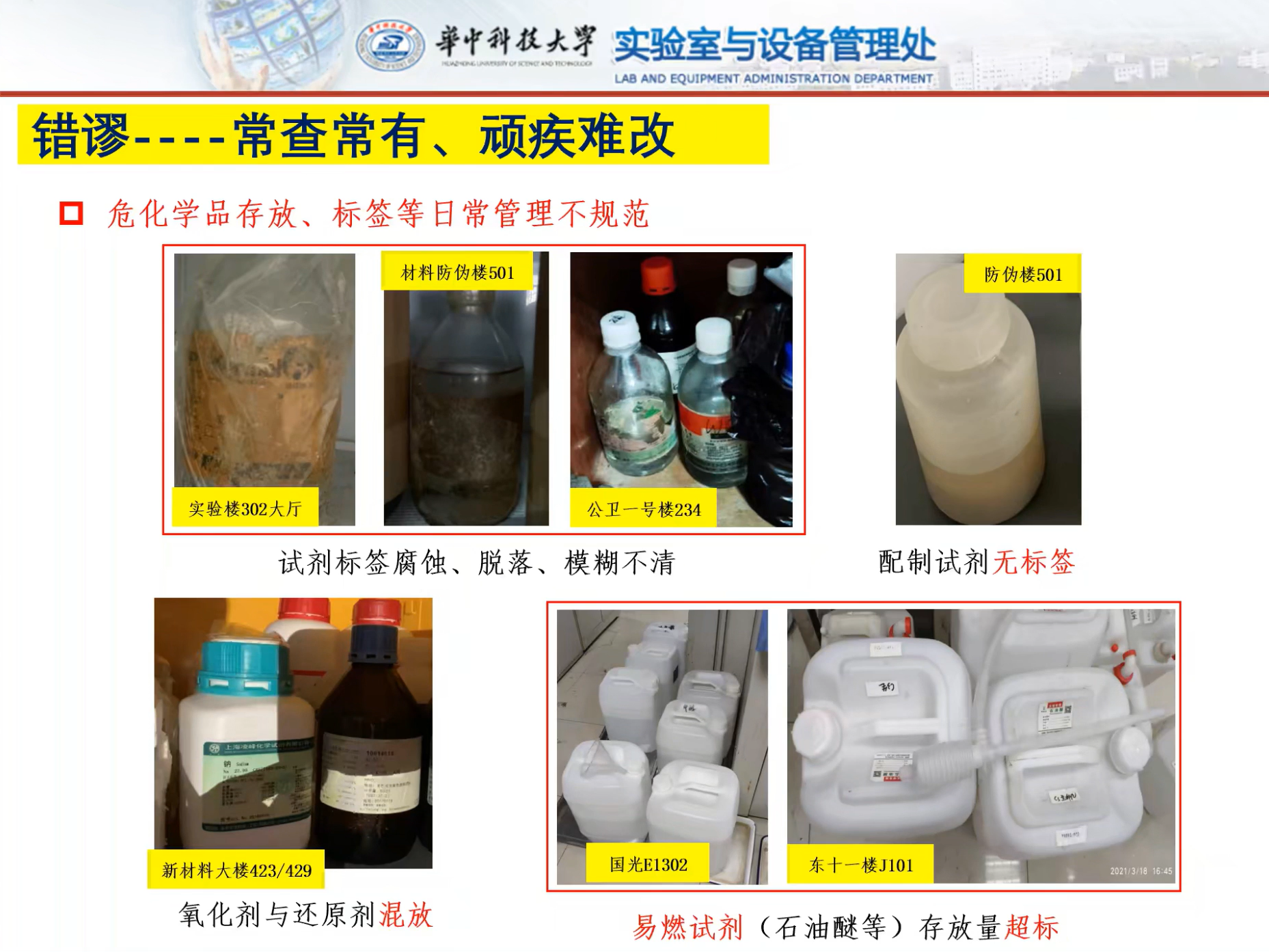 李教授通过分析国内外高校实验室安全事故案例,结合当前高校实验室安全管理现状,从“尽职守则、危害识别、风险评估、消除隐患、预防防范”等角度,对实验室安全管理进行了重点论述。在讲座中,李教授强调造成安全事故的主要原因是对安全规范的不理解、不重视、不习惯,以及安全监管的不完善,并指出高危化学品管理不严、气瓶气路管理不善、废弃物管理不规范、水电管理不专业等实验室常见的隐患顽疾,呼吁师生从提高安全认知入手,互相帮助,共同做好实验室安全工作。最后,李教授介绍了华中科技大学先进实验室的优秀管理经验,建议师生从基本的卫生值日做起,持之以恒,跬步千里,从对安全心动,到对安全行动。
