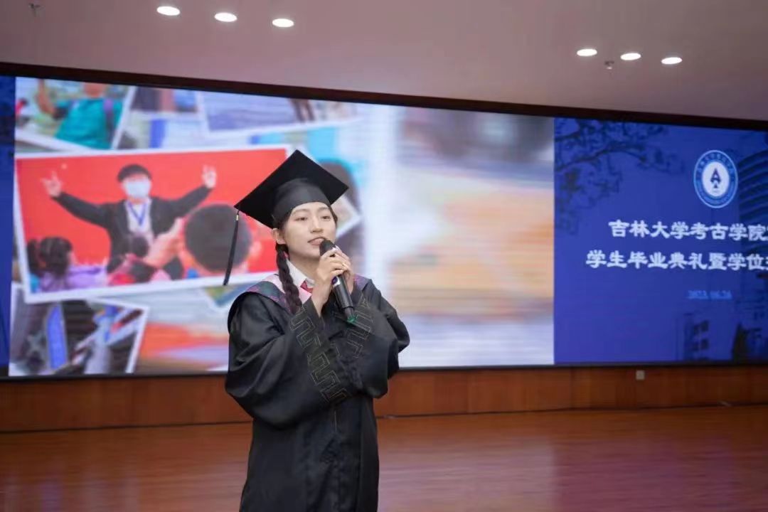 工作中取得的一系列成果,结合自身感悟,在致辞中向同学们提出三点殷切期望:第一,要永葆一颗“公而忘私”的爱国之心,甘于奉献,勇于担当。第二,要坚守一颗进取之心,保持独立的思考和判断。第三,要修炼一颗豁达之心,热爱生活,达观处事。赵宾福院长勉励全体毕业生要在日后继续发扬吉大考古人的治学精神、探索精神和奉献精神,主动肩负起“讲好中国故事”的使命担当,以为专业知识素养为舟楫,开拓未来、奉献社会,为中华民族伟大复兴做出应有的贡献。