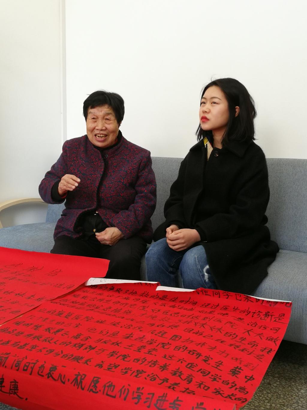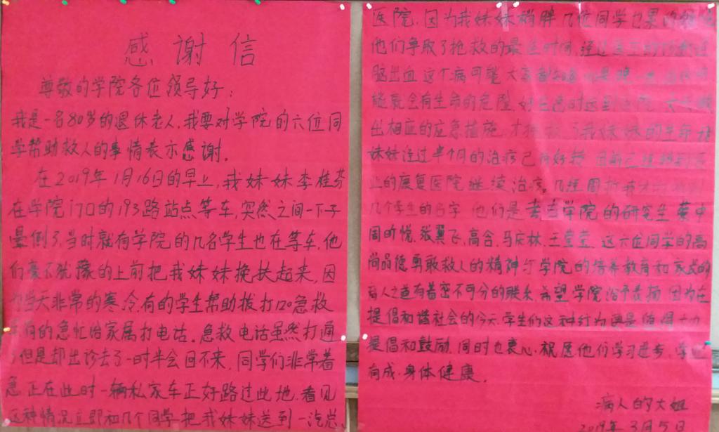 学生:2018级硕士生张翼飞、周昕悦、高晗、王莹莹、马庆林和2018届本科毕业生蔡中等6名同学发现这一情况后,毫不犹豫地将老人妹妹搀扶起来。即便当天天气非常寒冷,学生们有的联系家属,有的拨打120求助电话,但由于救护车出急诊,当时无法及时赶过来。连续打几辆出租车见这种情况都没有载他们,在努力招手求救后终于有私家车停了下来,几个同学合力把老人抬上车,送到医院。后来经医院诊断,老人得的是脑出血,正是由于他们的及时救助,才为抢救赢得了宝贵的时间。几经周转,老人打听到几个同学的名字,趁学校刚刚开学之际,老人妹妹也稍有好转的情况下,特意来色情直播