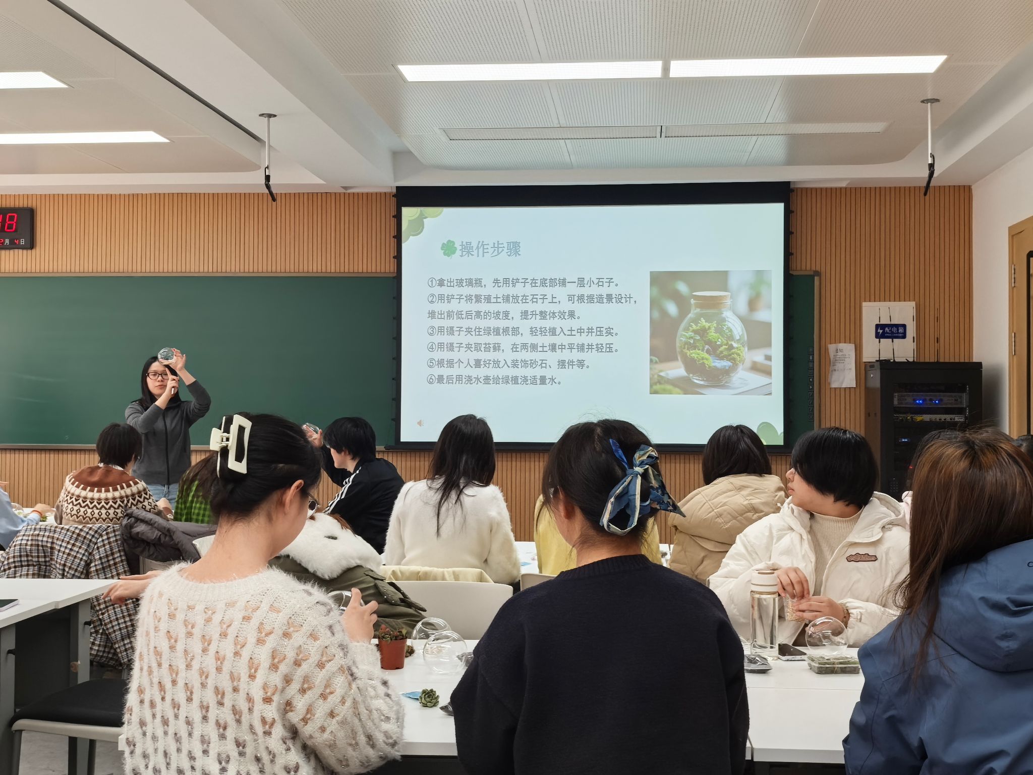 随后,李思雨同学从所需材料到制作步骤,为同学们详细讲解并演示了如何制作绿植微景观。现场的同学们认真聆听细节,对亲手制作绿植微景观跃跃欲试。