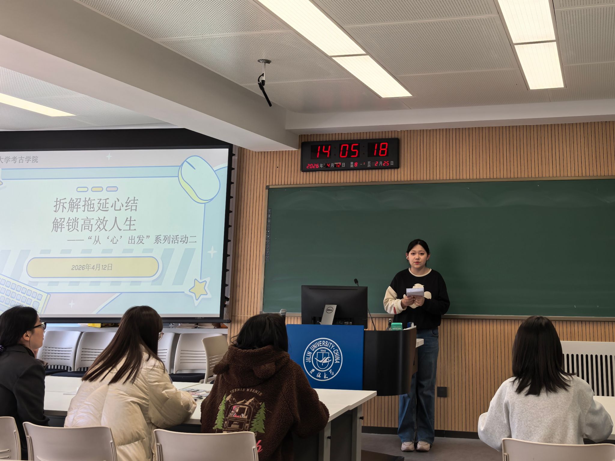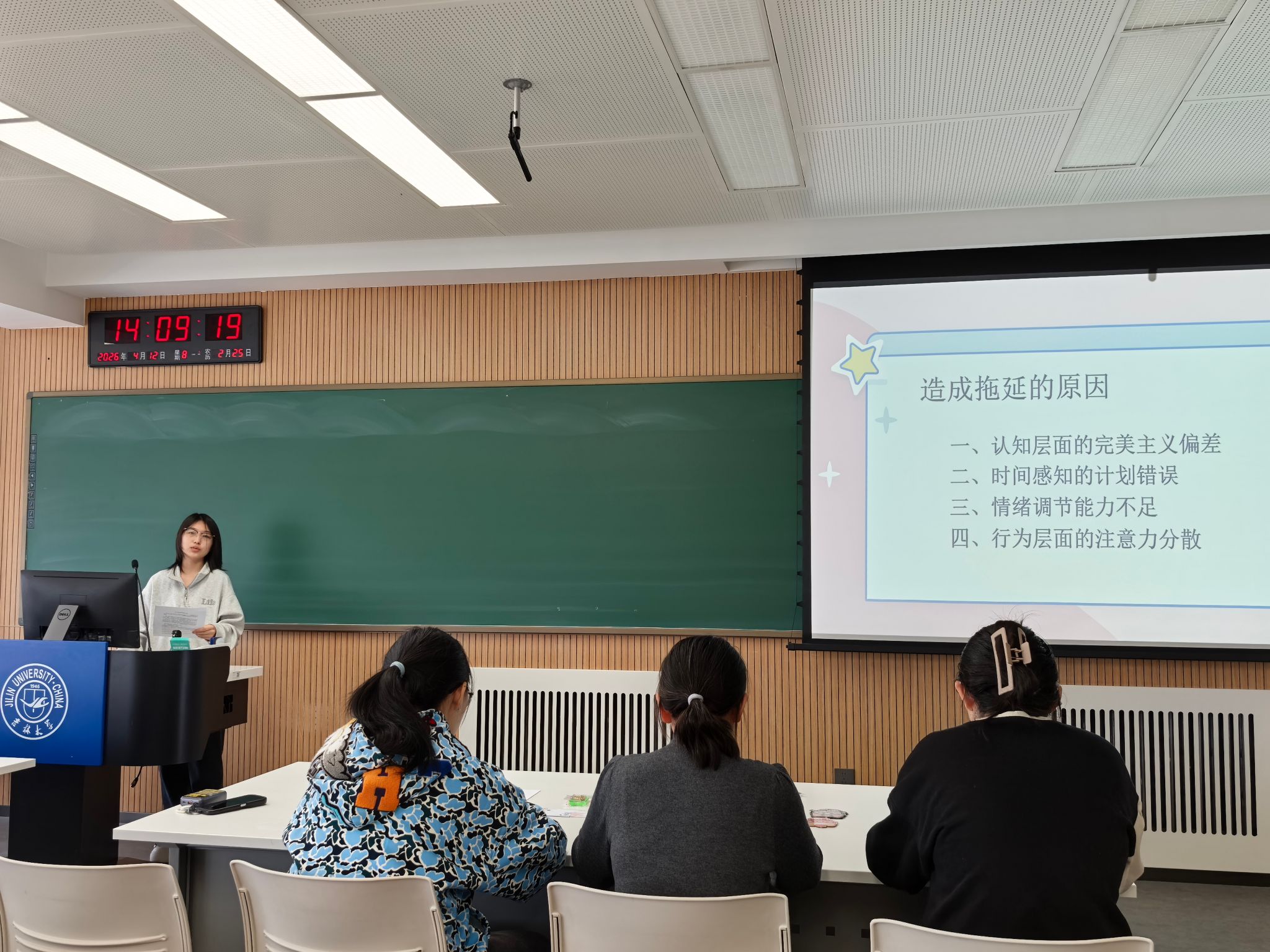 活动伊始,董子怡同学围绕拖延的本质、成因与应对策略展开分享,系统讲解拖延的核心定义,从认知偏差、时间感知、情绪调节、行为专注四个维度深度剖析拖延根源,并结合校园学习生活实际,给出可落地、易操作的改善方法,帮助同学们科学认识拖延、理性面对拖延。